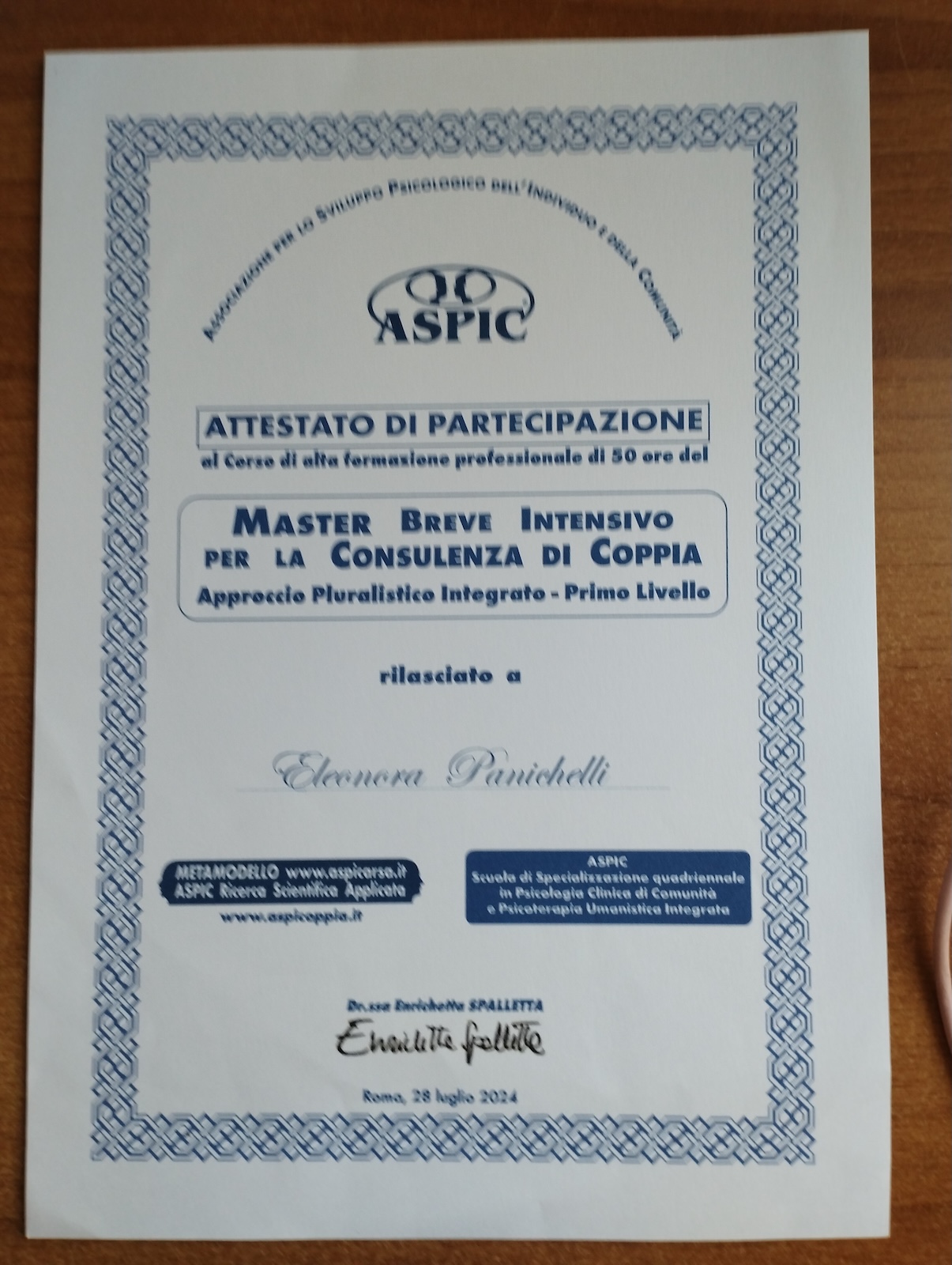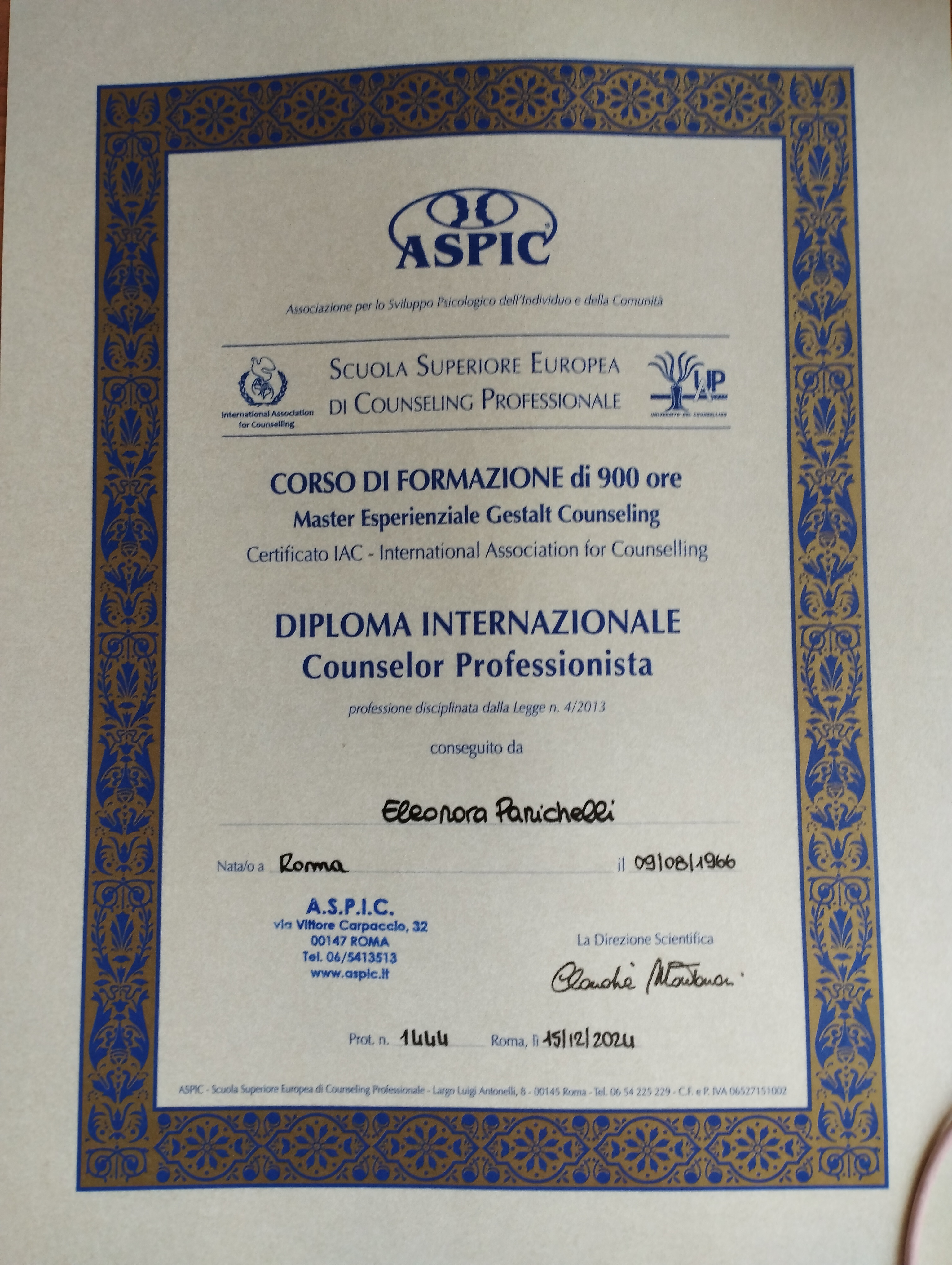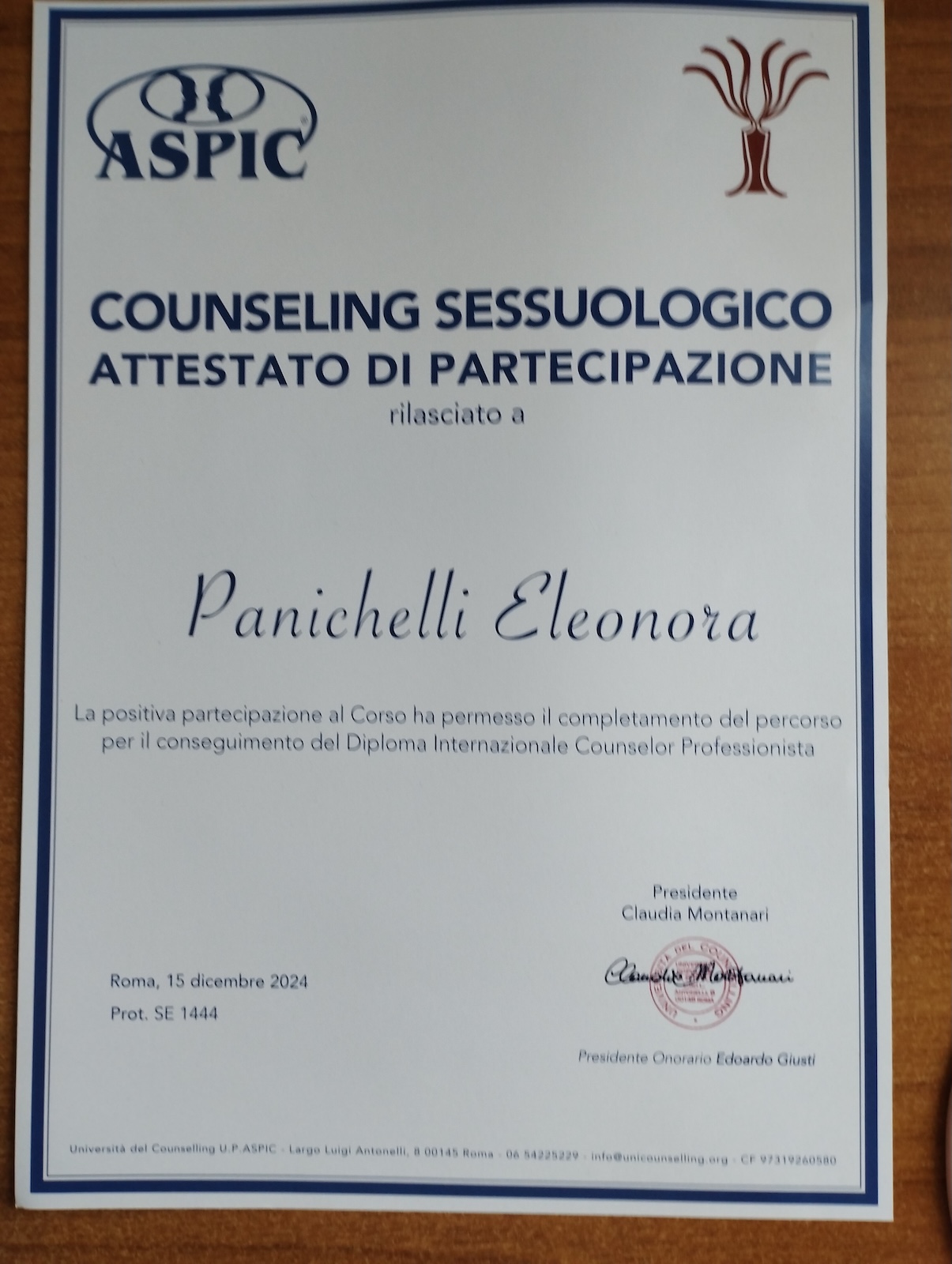 Ho conseguito il diploma di counselor professionista presso ASPIC, Scuola Superiore Europea di Counseling Professionale. Mi sono specializzata in counseling sessuologico, counseling di coppia e counseling individuale. Il mio percorso nasce dalla convinzione che ogni persona possieda dentro di sé le risorse per il proprio benessere, anche nei momenti difficili, e che la relazione di aiuto possa facilitare questo processo.